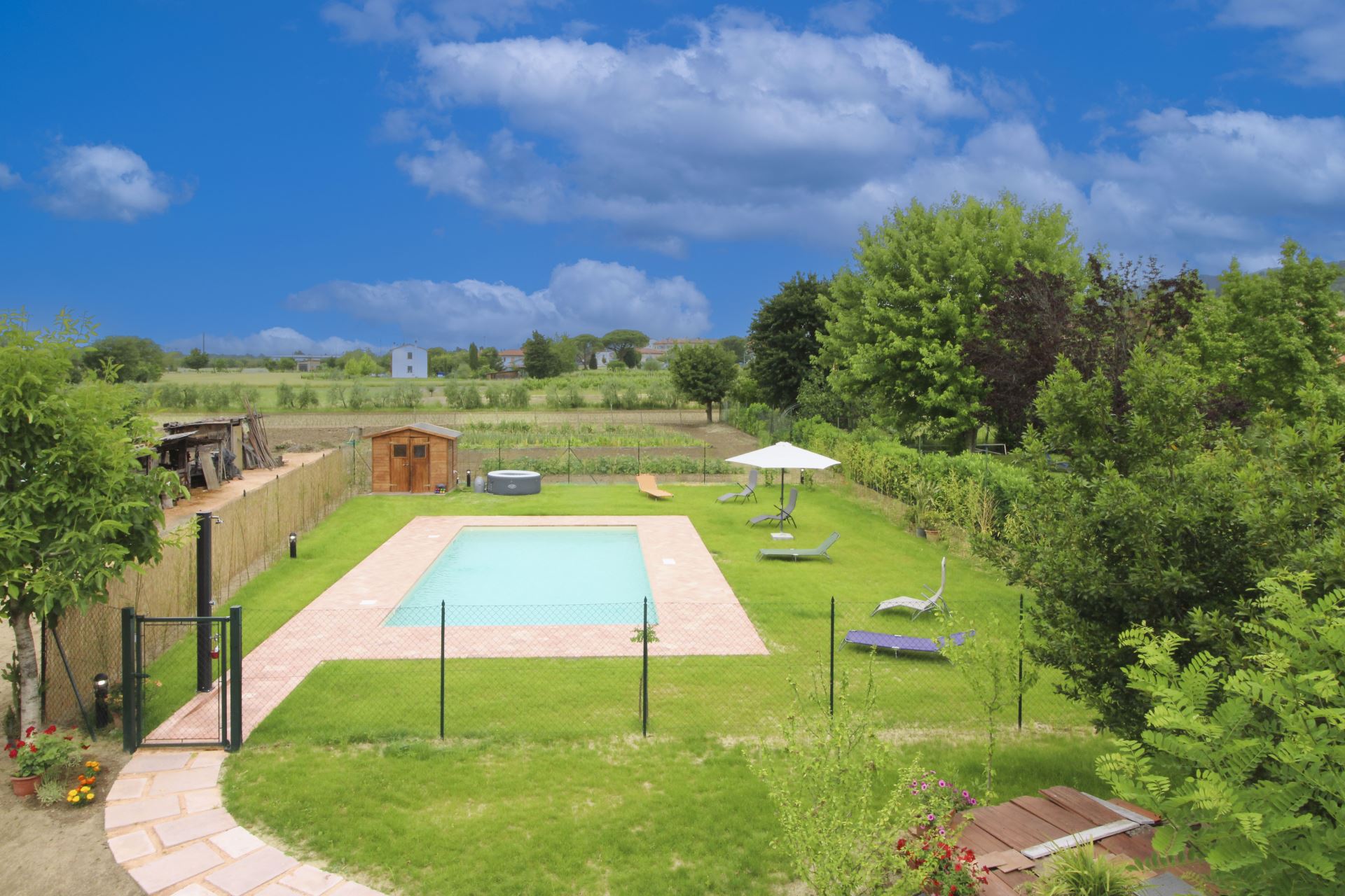 Eine weitere Ecke, die Sie sicher zu schätzen wissen werden, ist die Sonnenterrasse im ersten Stock, wo Sie einen kleinen Aufenthaltsraum mit Sonnenschirm, Tisch und Stühlen finden, ideal für einen Aperitif an kühlen Sommerabenden. Es gibt auch einen Gemüsegarten mit frischem Gemüse der Saison, das Sie täglich ernten können.