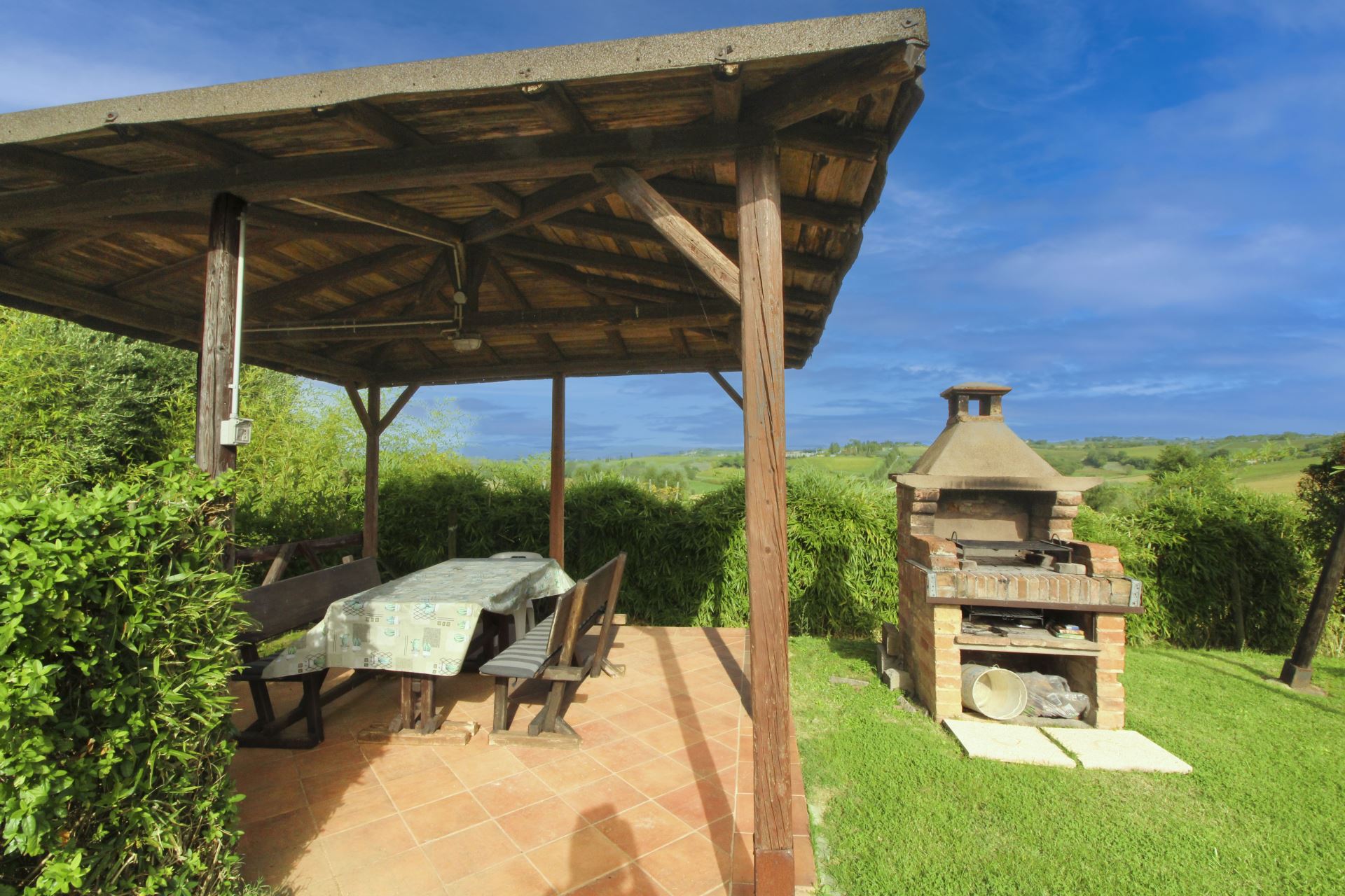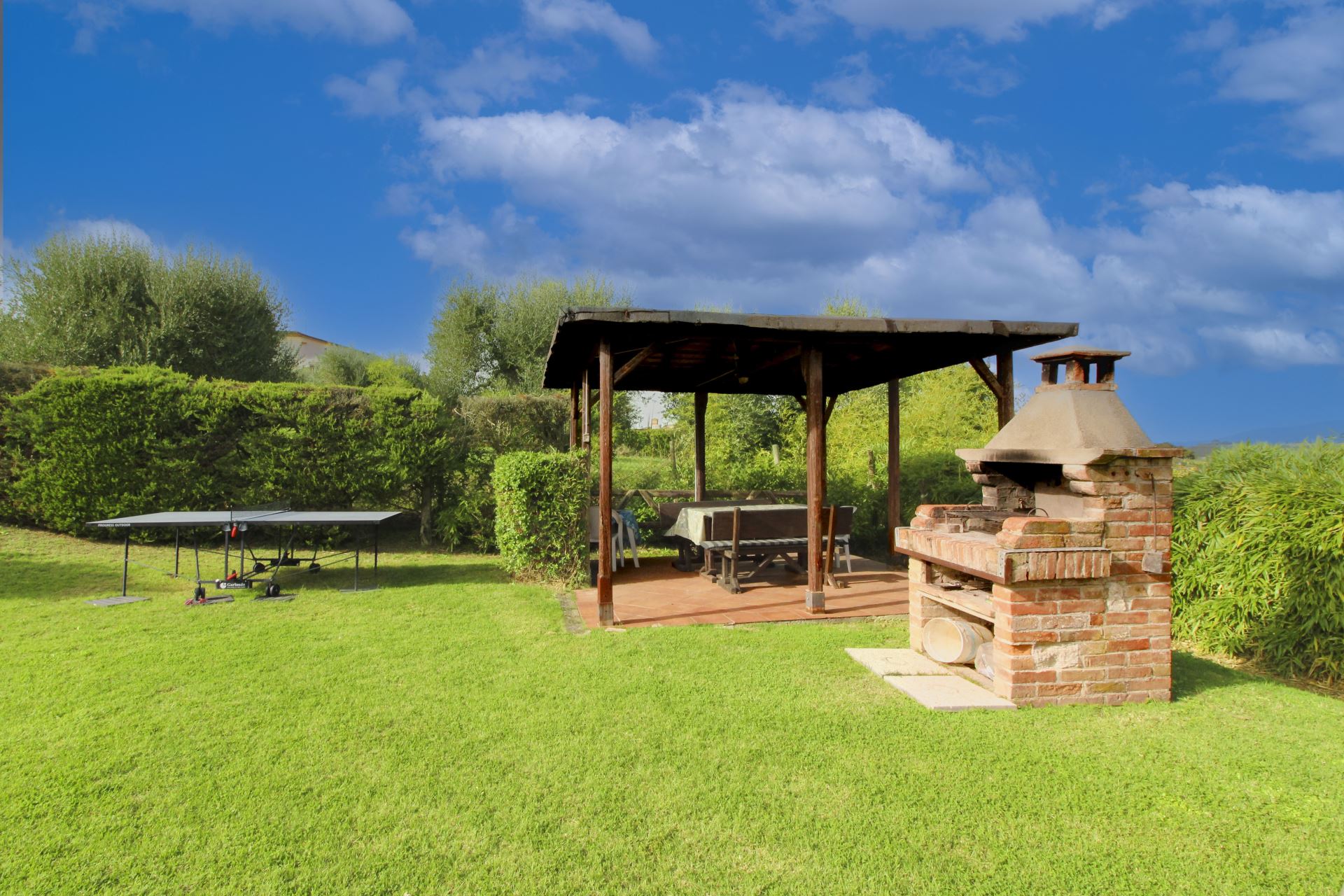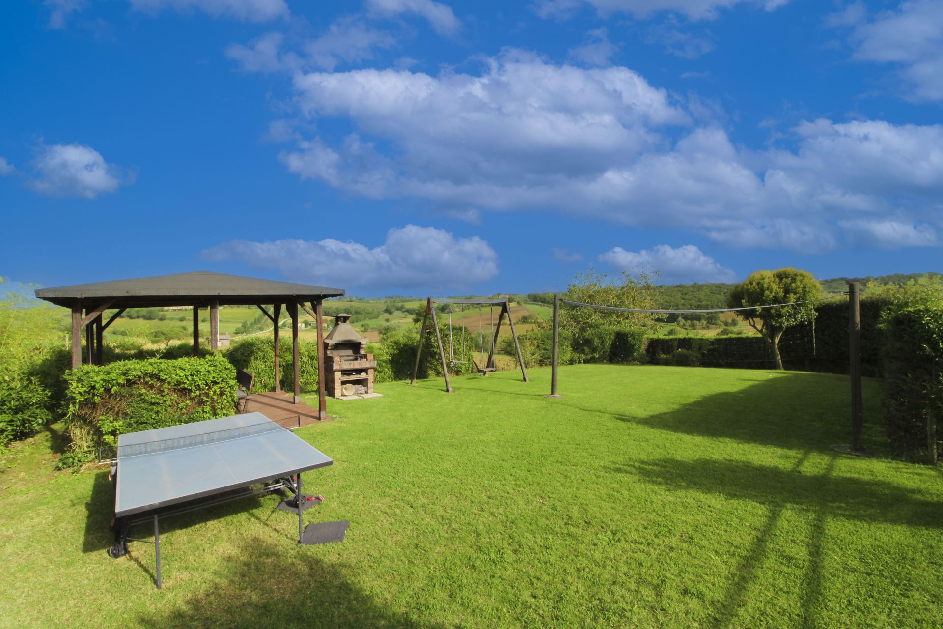 The farmhouse, divided into two apartments, Vigneto and Oliveto, features a large panoramic garden, a fenced swimming pool (6x12 m, depth 1.60 m, open from May 1st to September 30th), a gazebo with tables and chairs, a barbecue, a volleyball court, table tennis, swing, and shaded parking.