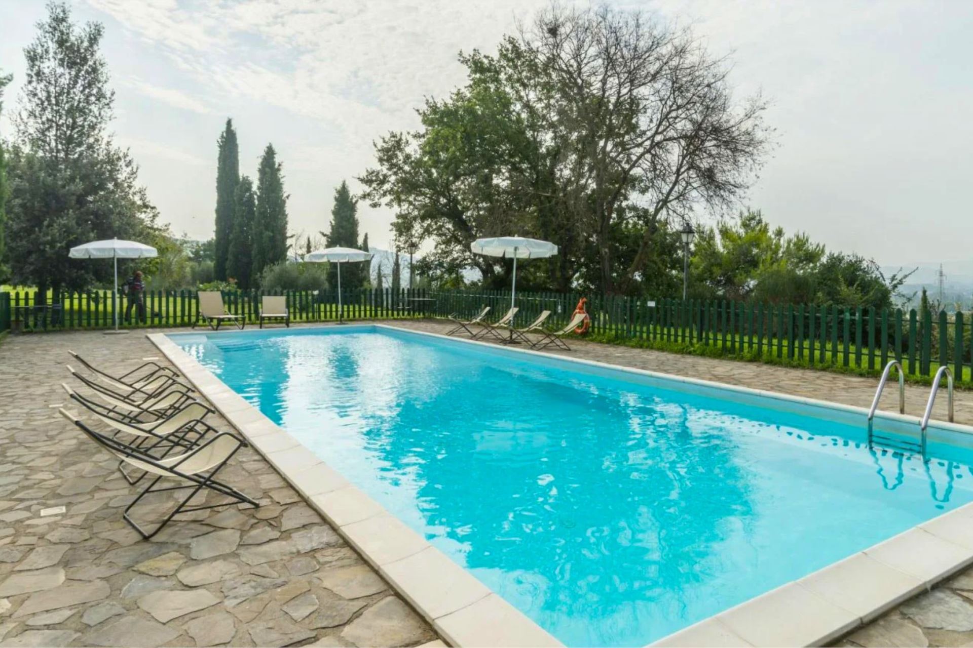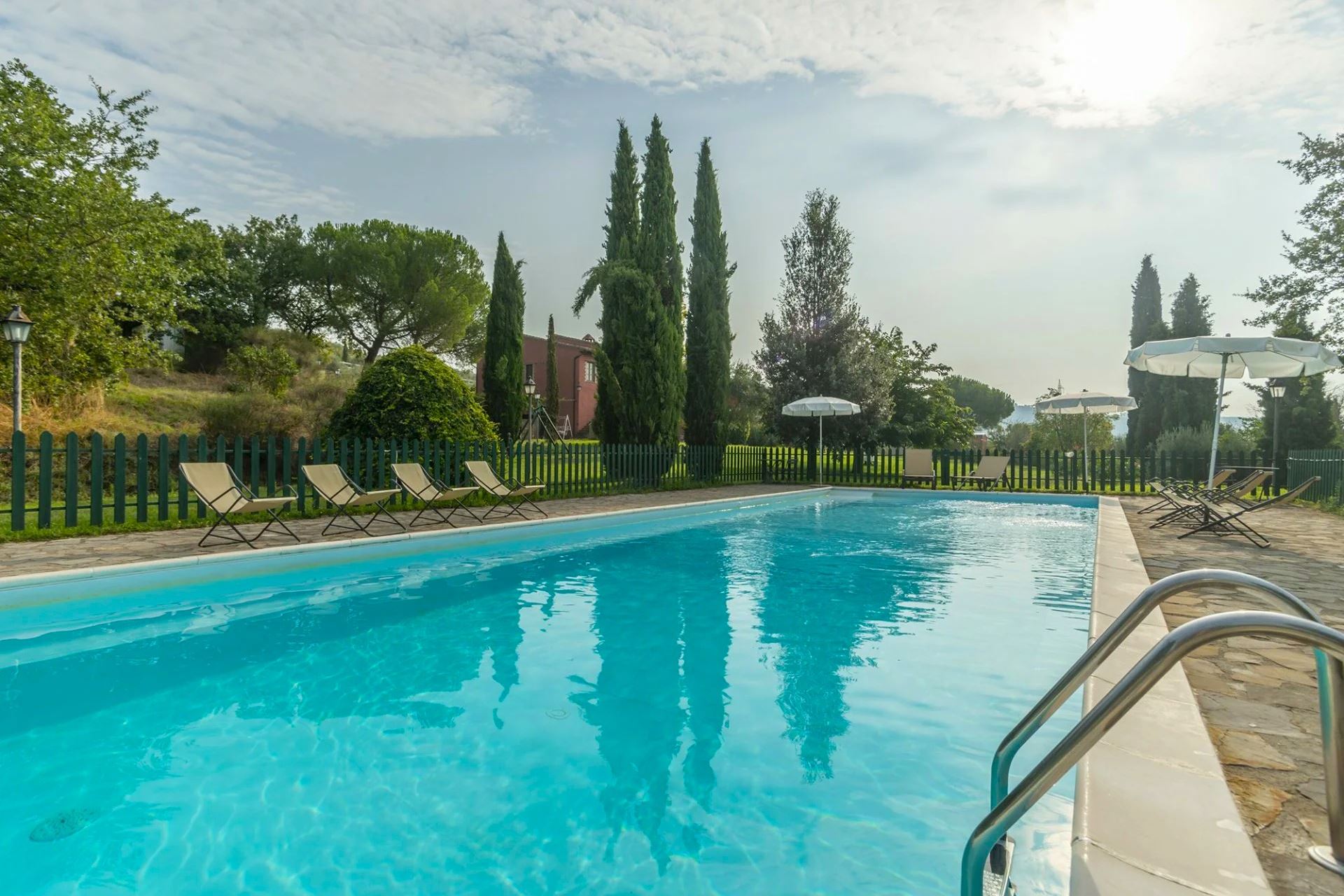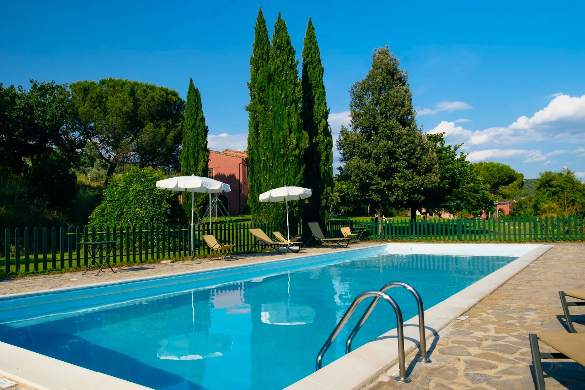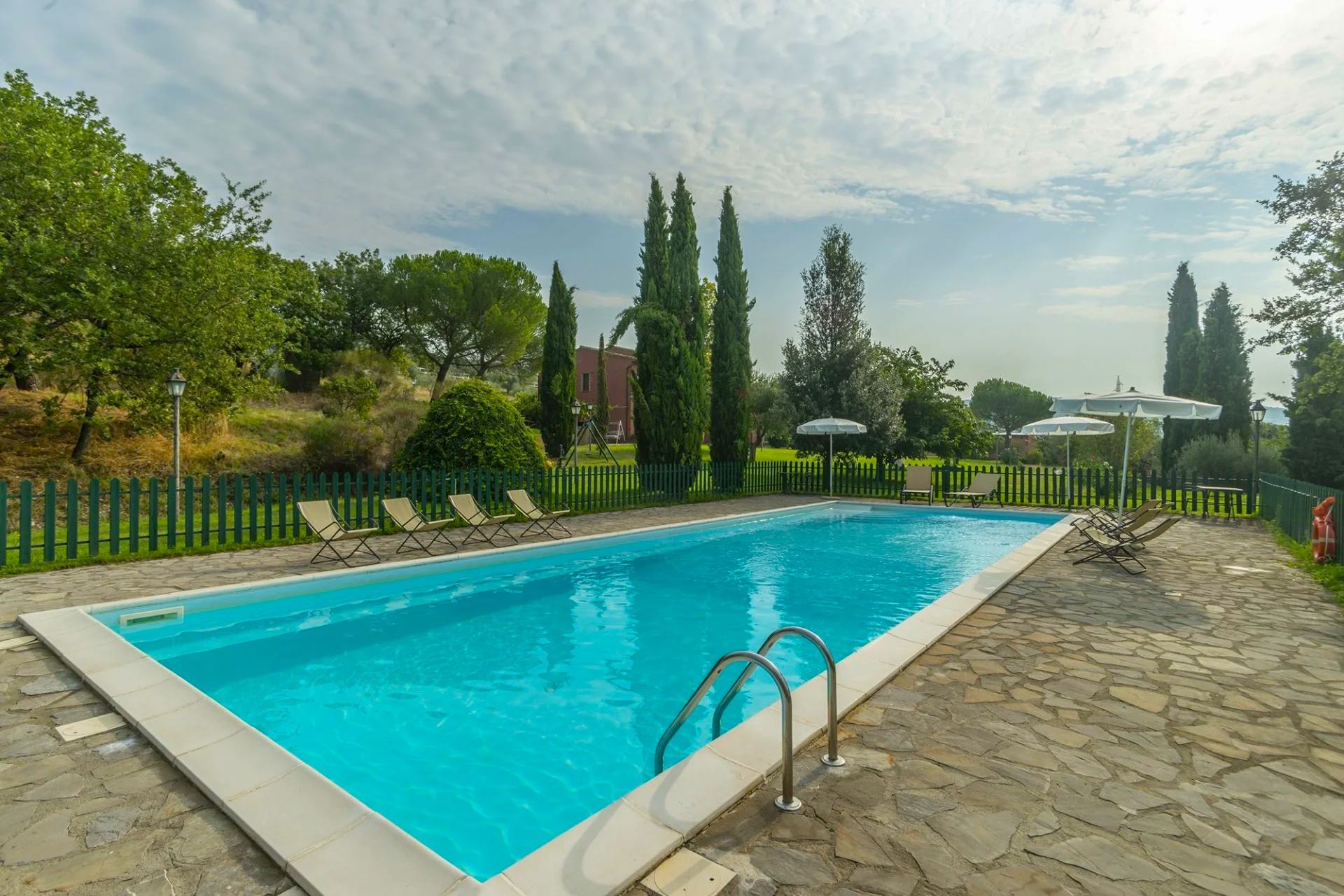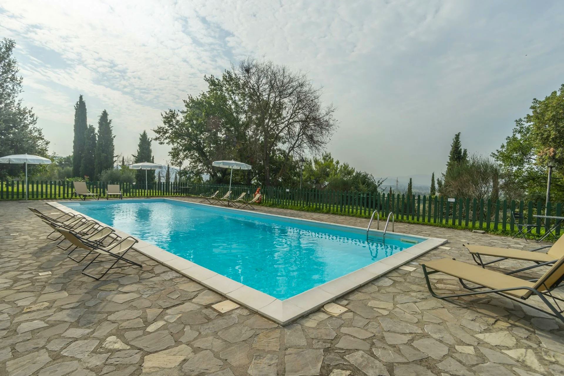 At your disposal, shared by guests, is a beautiful panoramic swimming pool (size 15x6 m, depth 0.60–2.10 m), fully fenced and harmoniously set within a large, well-kept and shaded green area, ideal for relaxing moments immersed in nature.