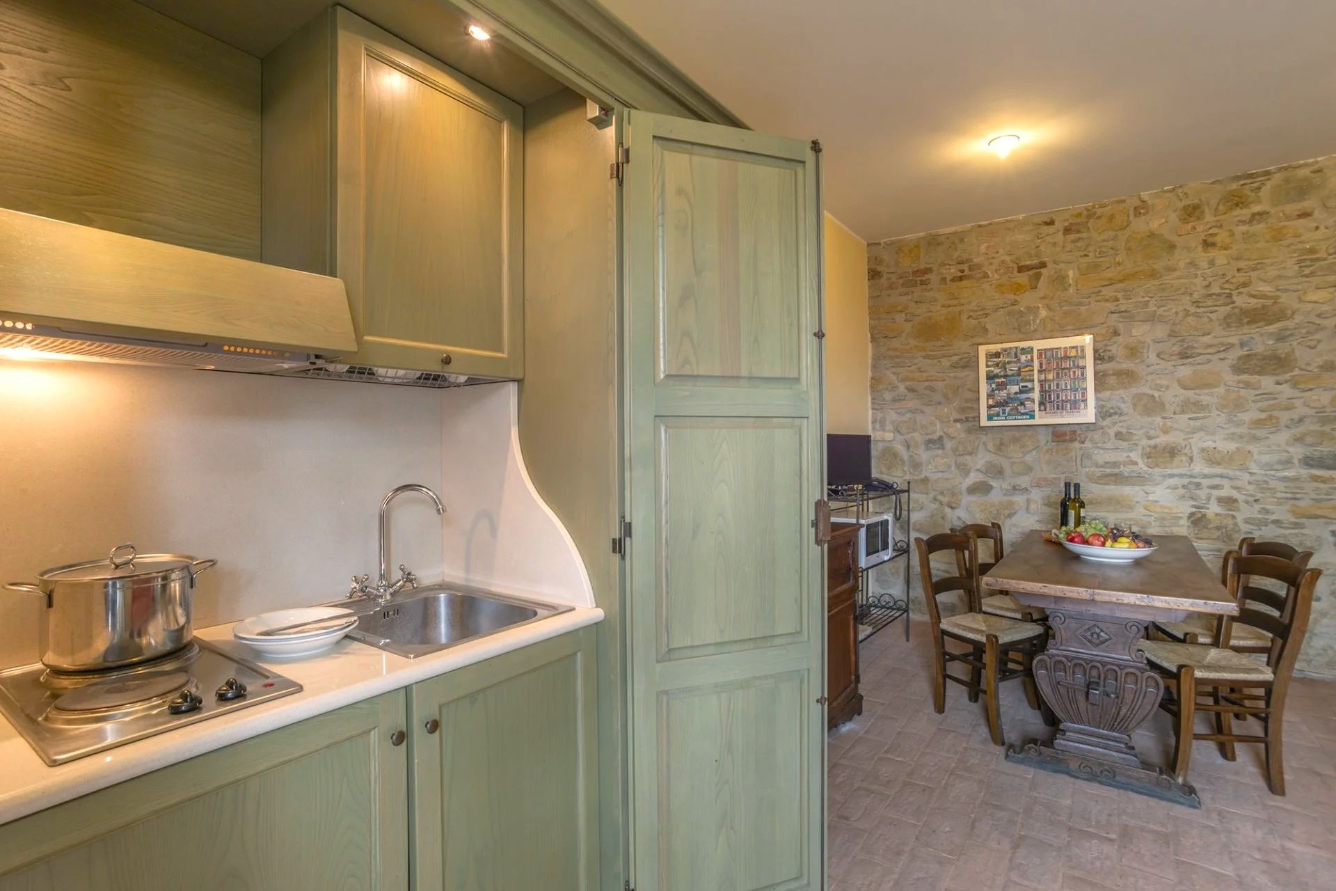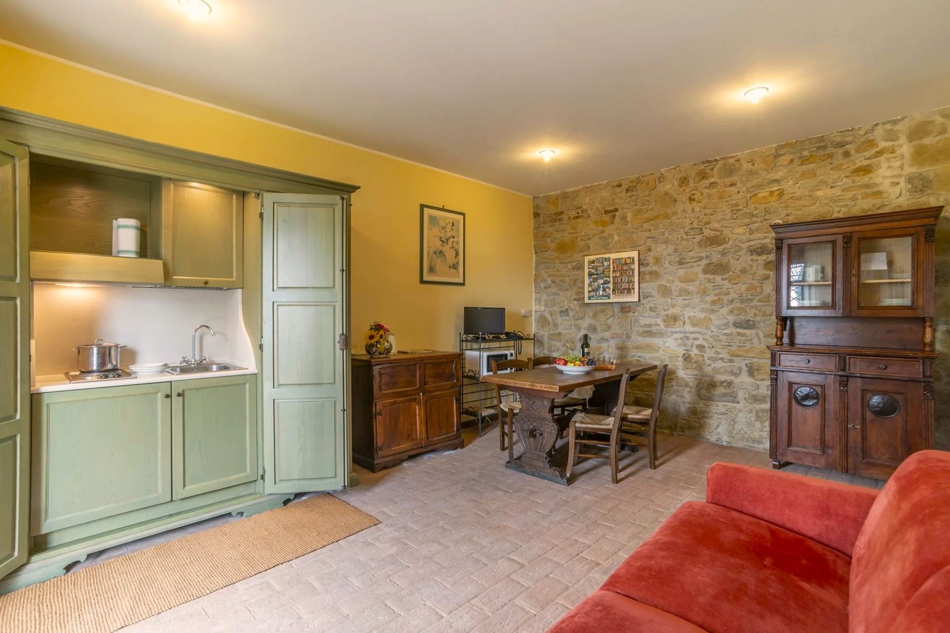 STRETTOIO: Studio apartment on the ground floor with independent entrance, living/dining room with large fireplace, small closable kitchenette, double bed and bathroom with shower.