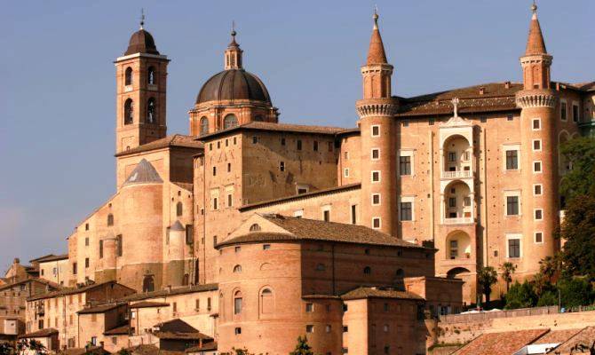 Ancienne ville d'origine romaine, Urbino a atteint son apogée à la Renaissance, lorsque le duc Federico da Montefeltro a établi l'une des cours les plus illustres d'Europe. Le symbole de cette période somptueuse est le Palazzo Ducale, l'un des plus impressionnants d'Italie, déclaré site du patrimoine mondial de l'Unesco avec le centre-ville historique. Construit dans la seconde moitié du XVe siècle, parallèlement à la transformation urbaine du vieux village dans le sens de la ville idéale de la Renaissance, le Palazzo Ducale comprend des cours, des salons, des loggias, des appartements et un vaste réseau de salles de service, dont le célèbre Studiolo del Duca, recouvert de splendides panneaux de bois incrustés. Aujourd'hui, il abrite le musée archéologique et la galerie nationale des Marches qui possède l'une des plus importantes collections de peintures de la Renaissance en Italie.