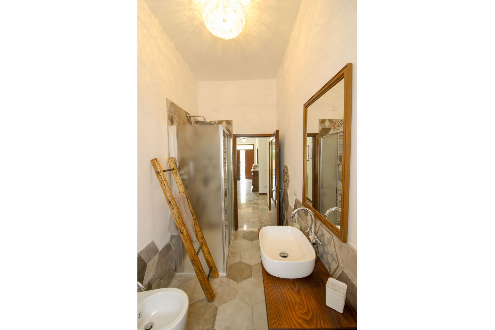 Trois chambres doubles, deux salles de bains avec douche. Petit salon avec canapé-lit double.