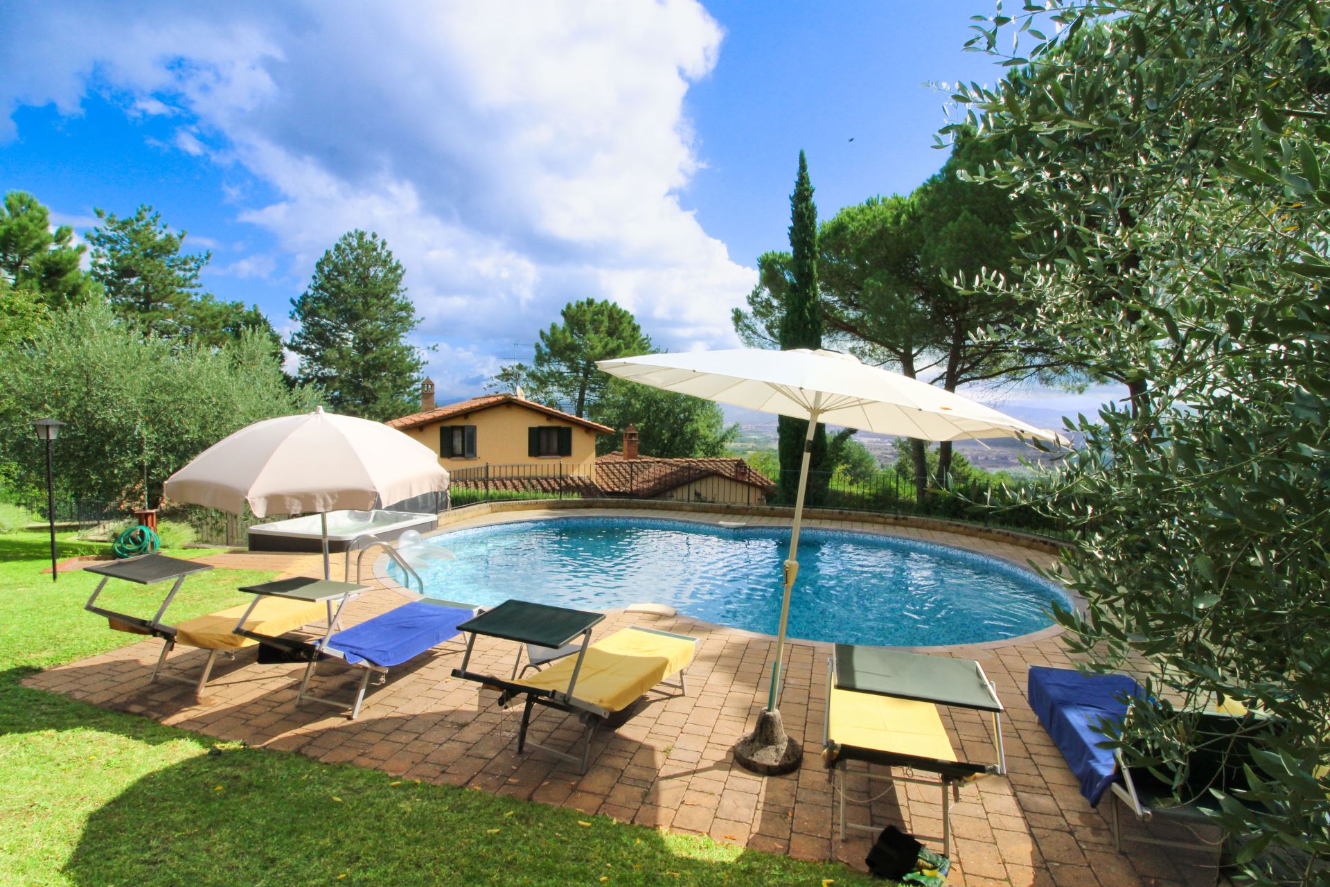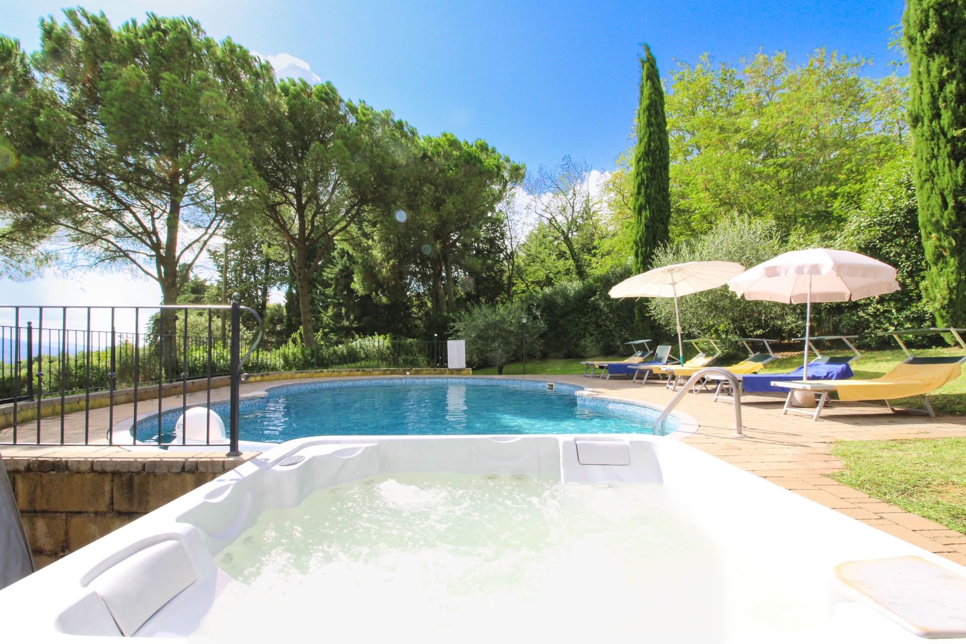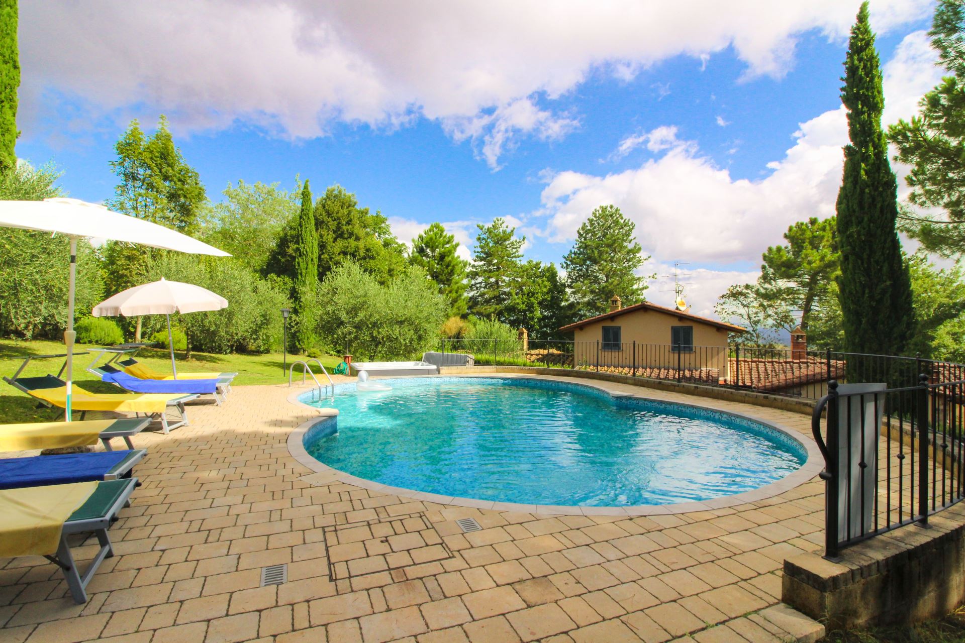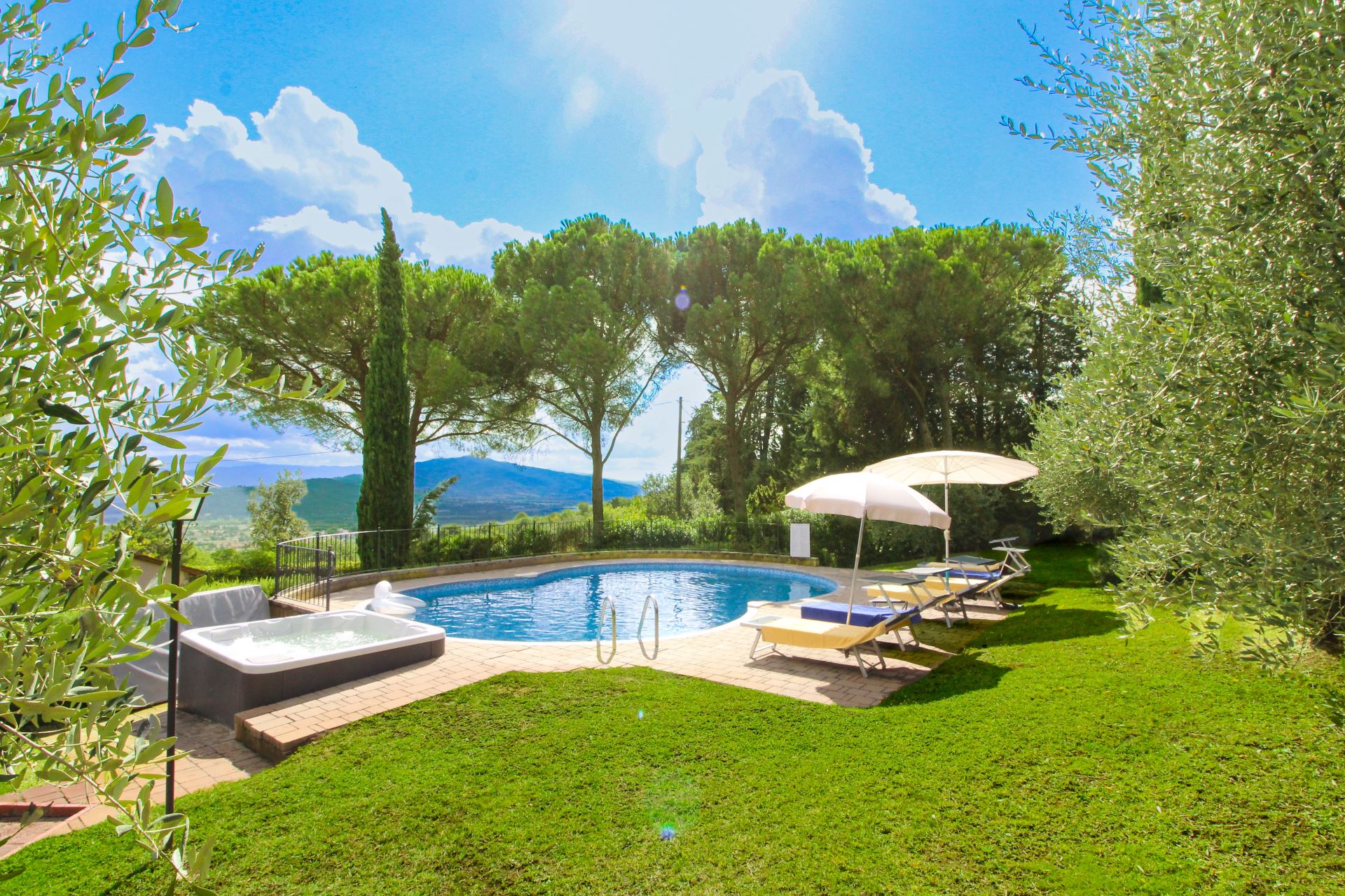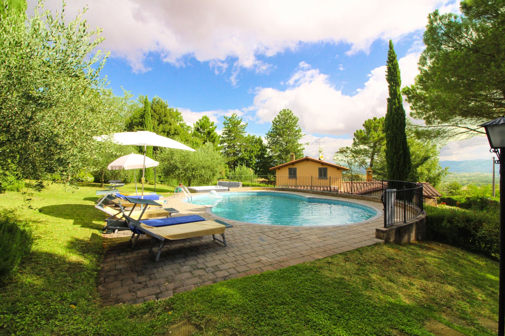C'è qualcosa di speciale in questa bella proprietà situata sulle boscose colline che separano la valle della Chiana da quella dell'Arno, che per la sua posizione, gode anche di un facile accesso alle città di Arezzo, Firenze e Siena. Forse è il giardino curato e panoramico ombreggiato da alti pini e completamente recintato, la piscina privata (dimensioni 6 x 9 m. - profondità 1,20 m. - aperta dal 01 Maggio al 30 Settembre) o forse la vasca idromassaggio (6 posti - a pagamento) posta tra gli olivi...? Oppure, potrebbe essere l’idea stessa della villa di campagna, la sua posizione appartata ma non isolata, e la calda atmosfera creata all'interno con colori pastello e arredamento rustico in stile.