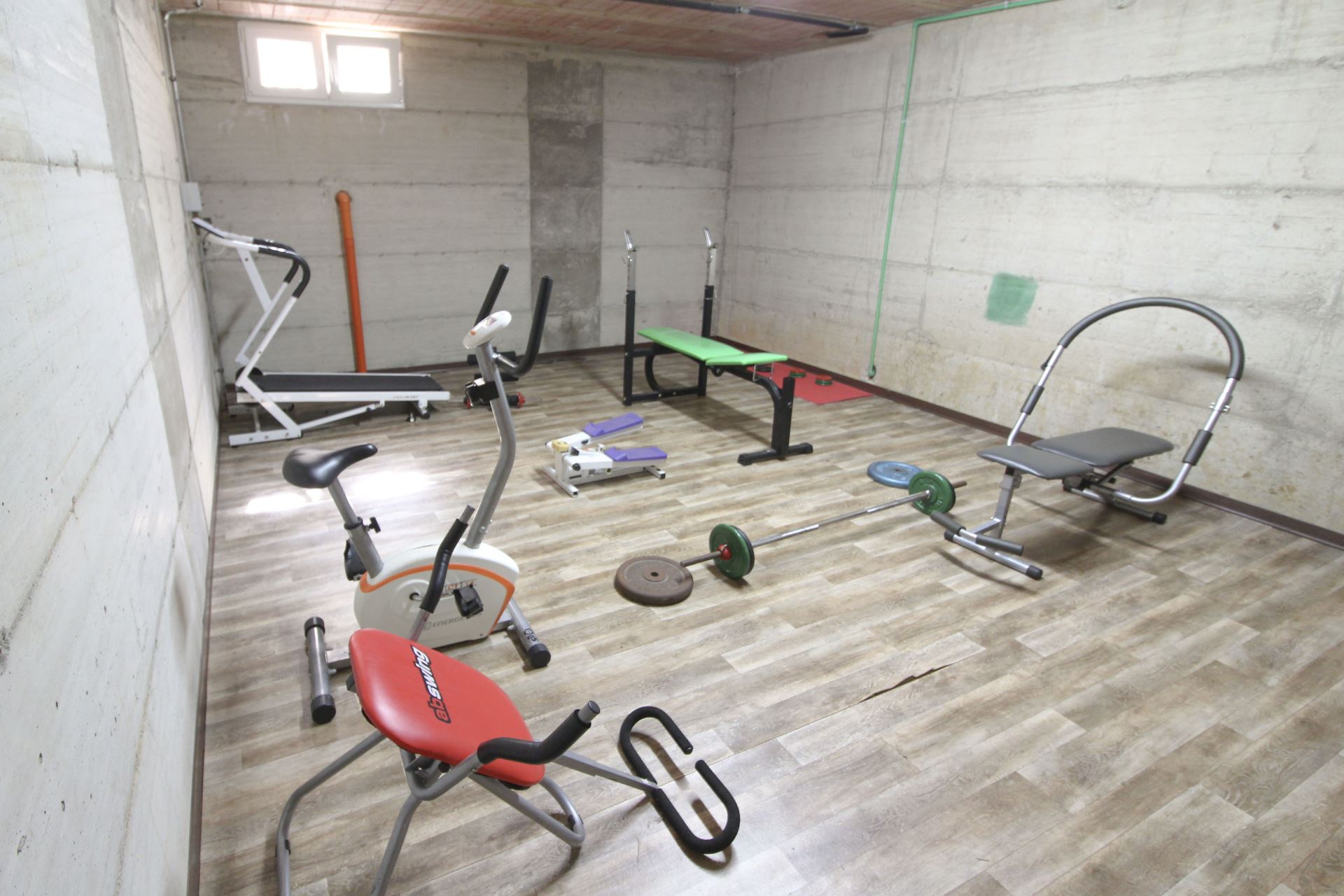 PIANO SEMINTERRATO: Locale lavanderia con lavatrice e ferro da stiro, palestra attrezzata con panca con pesi, tapis roulant, step, cyclette ecc ...